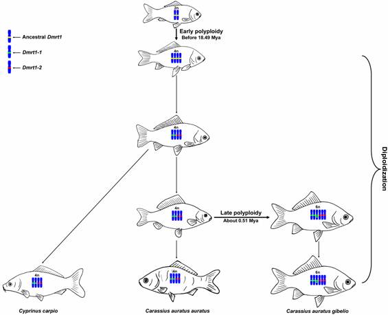 Significantly, the evolutionary relationship analyses among cDNA and genomic DNA sequences of these Dmrt1 genes revealed two rounds of polyploidy origins in the gibel carp: an early polyploidy might result in an common tetraploid ancestor of Carassius auratus gibelio, Carassius auratus auratus and Cyprinus carpio before 18.49 million years ago (Mya), and an late polyploidy might occur from evolutionary branch of Carassius auratus at around 0.51 Mya, which lead to the occurrence of the hexaploid gibel carp. Therefore, this study provides clear genetic evidence for understanding occurrence time and historical process of polyploidy in polyploid vertebrates.
