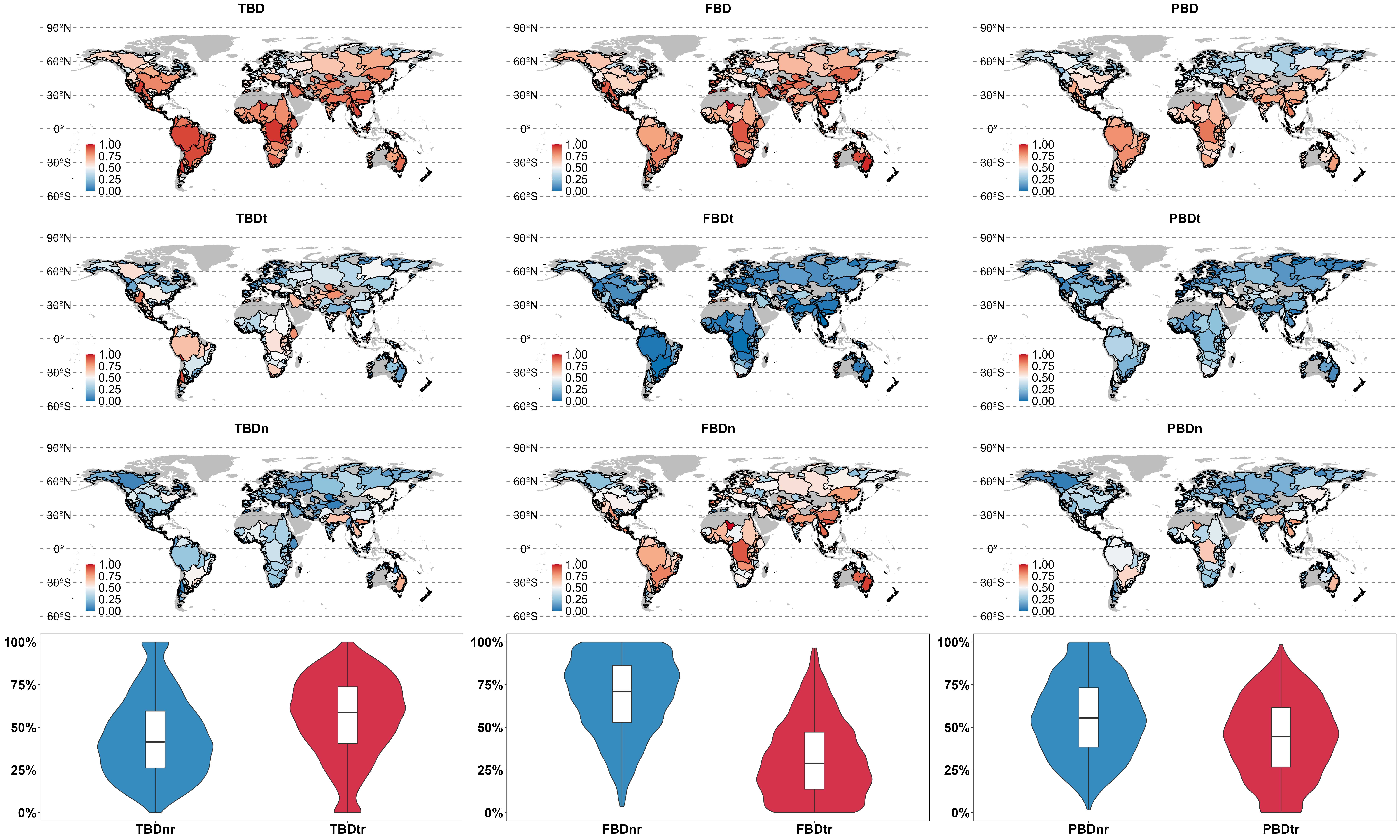 Maps of freshwater fish taxonomic (TBD, TBDn and TBDt), functional (FBD, FBDn and FBDt), and phylogenetic beta diversity (PBD, PBDn and PBDt) in the global watersheds. (Image by IHB)