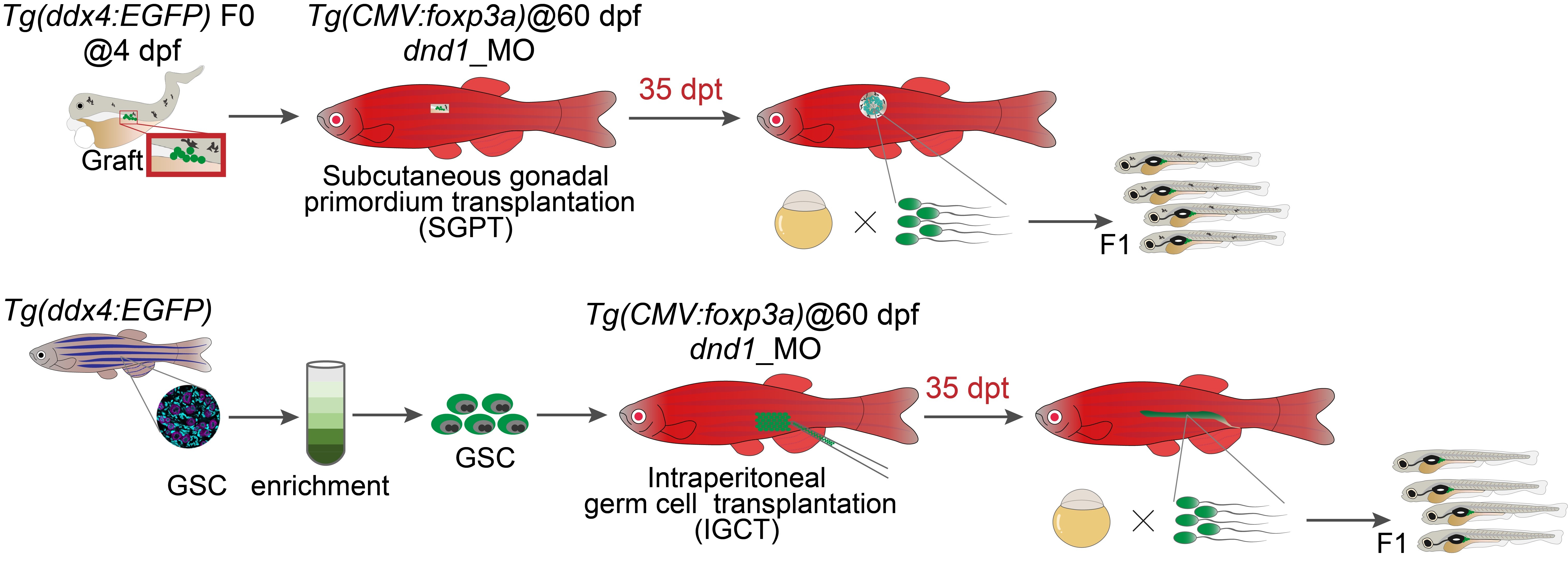 The generation of genetically modified lines in model and economically species typically requires months or even years. Developing strategies to accelerate this process is therefore a critical need in the field. Transplantation of allogeneic gonadal primordia into near-mature recipients offers a promising approach for rapid gamete production. However, a major challenge is overcoming immune rejection of donor tissues.